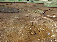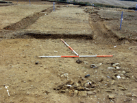 Careful and painstaking cleaning of the metalled surfaces associated with the villa courtyard and the levelled base of the timber structural phase has clarified the overall plan of the timber building. The excavation confirmed that the edifice was a post and timber framed structure but not an aisled hall as had been previously tentatively postulated. Although some of the post pits holding the timbers of the structure had been subject to intense heat from a fire at the end of the buildings existence no internal hearth was located in the interior of the structure to suggest domestic occupation. The remains are more likely to reflect a more utilitarian agricultural purpose for this timber building.
