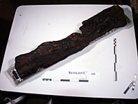 The barrel bung, a lathe plug from a wooden bowl and a leather fitment from last year's excavation are currently undergoing conservation at Leicester University and should be ready for display in the near future. Since the discovery of the original leather clover shaped fitting another one has been recovered and the exact purpose is at present under discussion. Hopefully Dr Graham Morgan from the university will also be undertaking the analysis of all the wooden artefacts from the site by the spring of 2004. The Anglo-Saxon sword recovered from the warrior burial and an iron strut from the bath house will be X rayed and the iron door key conserved and restored. The largest of the wooden stakes excavated in 2003 and some other wooden planking is to be assessed and possibly tested to see whether a denrochronological date can be extracted at Sheffield University in March 2004.