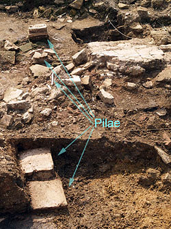 Underneath the general debris significant remains of a hypocaust system in the second room had been left in situ. It is larger than the previously excavated hypocaust located in the bath house and its relationship to any further rooms to the south waits to be discovered. Although the real purpose of the rooms may be open to interpretation the burnt stone and the charcoal associated with ventilation channels means that Room 1 served as a stoke room or praefurnium during a phase of its development and provided the heat for the large hypocaust system in Room 2.