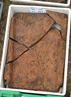 Stone and tile roof tiles were recovered during excavation as well as many fragments of boxflue tile. Unfortunately none of the boxflue tiles where found in situ so it was impossible to reconstruct the type of system utilised for distributing the heat up through the walls from the hypocaust. The roof appears to have been constructed of stone roof slates as opposed to ceramic tile. Those ceramic tile roof tiles that have been retrieved appear to consist exclusively of tegula without any examples of imbrex in the assemblage; although this may be evidence for selective reuse. The utilisation of stone roof tiles appears to be in line with our previous findings both at Whitehall and in the neighbouring villas that this building material is exclusively used in bath house construction because of its fire resistant properties.