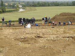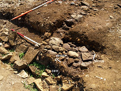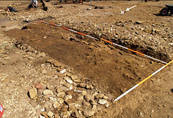 The floor plan of the two rooms, initially discovered last year, has demonstrated that part of the building was constructed on a terrace aligned along the contour. This finding has helped us to reassess the current interpretation of the development of the features across this area of the site. It demonstrates that the north south ledge cut across the general slope of the field was not as thought part of a revetted edge for the metalled platform on which the Post Roman timber phase was constructed. Instead, the considerable amount of re-deposited building stone covering this part of the site should be viewed as relating to the demolition of the superstructure of the original building range. However this interpretive change doesn't undermine the evidence for the archaeological sequence previously established for the Post Roman development further up the slope to the west. In reality it just highlights the complexity of the stratigraphic record of the features and buildings associated with the lower slope.