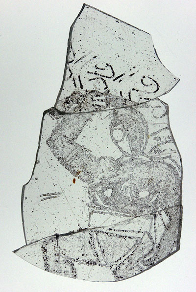 It's a small piece of fine glass, engraved or etched with the figure of a gladiator. It was almost certainly part of a drinking vessel, and was found in the sealed context of room 3B of the bath house. We have been told that this is the fifth "gladiator" vessel found in the UK. In case you are wondering - no, it is not a female gladiator! The "breasts" are parts of a male gladiator's armour, modelled, apparently, on an Etruscan warrior's armour. Here's a computer-generated assembly of three of the pieces: