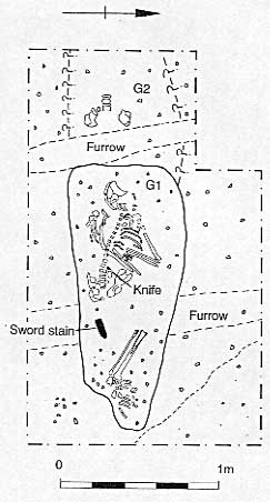 A trench c.1.4m x 2.4m was excavated over the find spot to uncover the remains of the burial associated with the sword. The burial Gl was located in a shallow grave of c.1.8m x 0.75m cut into a compact sandy yellowish / brown subsoil which contained a large percentage of rounded gravel, the grave cut was not clear.