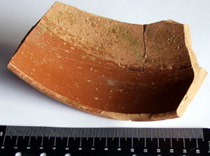 A samian mortarium (form 45) with a near upright wall. The form is East Gaulish and manufactured in the late 2nd to mid 3rd century.