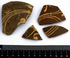 Slipped and decorated sherds of a Nene Valley colour-coated beaker. The form was manufactured between the late 2nd and early 3rd centuries.