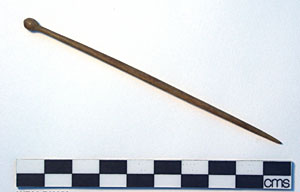 The length of hair pins varied with hair styles. Shorter hair pins, like this one, tend to be of a later date than longer pins like the one below.
